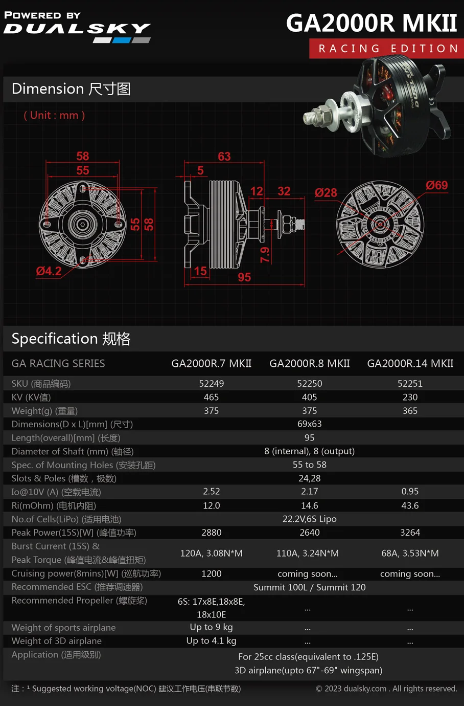 Dualsky GA2000R MKII 230KV 405KV 465kV Fixed wing Aircraft Brushless motor suitable for 90E-110E level 20cc gasoline engine