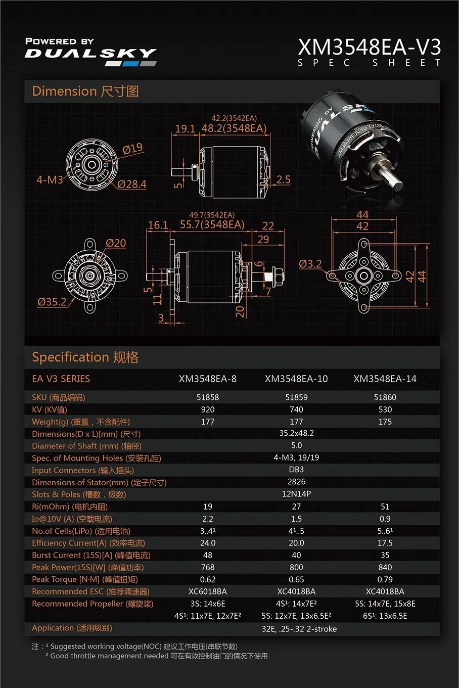 Dualsky XM3548EA V3 530KV 740KV 920KV Brushless Outrunners Motor for Advanced RC Stunt/3D Glider Models and 32E Fixed Wing UAV