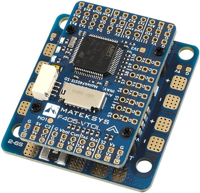 The MATEKSYSSYS F405-VTOL Flight Controller features 25x25 and 35x35 mounting patterns and weighs 25g. It features a Barometer, BlackBox MicroSD, 6x UARTS, 4x ADC, 12x PWM outputs, 2x PINIO (Camera switch, P101 pad), PDB for 5x individual ESC/Motors, 6.8-30V DC IN (2-6S LiPo), 220A High-precision current sensor, BEC 5V 2A for FC and peripherals, BEC 9V 2A (12V options for Camera/VTX), BEC VX 8A cont. 10A Peak for servos.Note: (Insert any product notes here in Red BOLD Italic. Example: "First Shipment expected January 2022" or "Electronics are Not Included".)VIDEO: (Insert Video Title here in Bold)FeaturesBEC VX 8A cont. 10A Peak for servos (5V,6V,7.2V option)BEC 9V 2A, 12V option for Camera/VTX2x PINIO (Camera switch, P101 pad)25x25 and 35x35 mounting patterns220A High-precision current senseBEC 5V 2A for FC and peripheralsPDB for 5x individual ESC/Motors6.8-30V DC IN (2-6S LiPo)MCU STM32F405RGT6Barometer SPL06-001BlackBox MicroSD12x PWM outputsIMU ICM42688-POSD AT7456E6x UARTS4x ADCUSE BULLETED FEATURE HERE IN BOLD CAPS.Add additional feature descriptions here to describe the above.USE BULLETED FEATURE HERE IN BOLD CAPS.Add additional feature descriptions here to describe the above.SpecificationsMounting: 25 x 25mm-Φ2mm, 35 x 35mm- Φ4mmBuilt in inverter on UART2-RX for SBUS inputMCU: STM32F405RGT6, 168MHz , 1MB FlashUSB/Beep Extender with Type-C(USB2.0)6x UARTs, 1x Softserial_Tx option(INAV)4x ADC (VBAT, Current, RSSI, Airspeed)Weight: 25g w/ USB/buzzer adapterSwitchable Dual Camera Input1x spare PINIOOSD: AT7456EDimensions: 45 x 42 x 15mmBlackbox: MicroSD card slot12x PWM outputsIMU: ICM42688-PBaro: SPL06-0011x I2CFC FirmwareINAV: MATEKSYSF405TE_SD (INAV 5.0 or newer)ArduPilot: MatekF405-TEPDBBattery Voltage divider 1K:20K (Scale 2100 in INAV, BATT_VOLT_MULT 21.0 in ArduPilot)Support continuous load of up to 30A & peak of 50A on each ESC pad of QuadcopterSupport continuous load of up to 100A on ESC pad near the current sensor resistorCurrent Senor: 220A, 3.3V AD