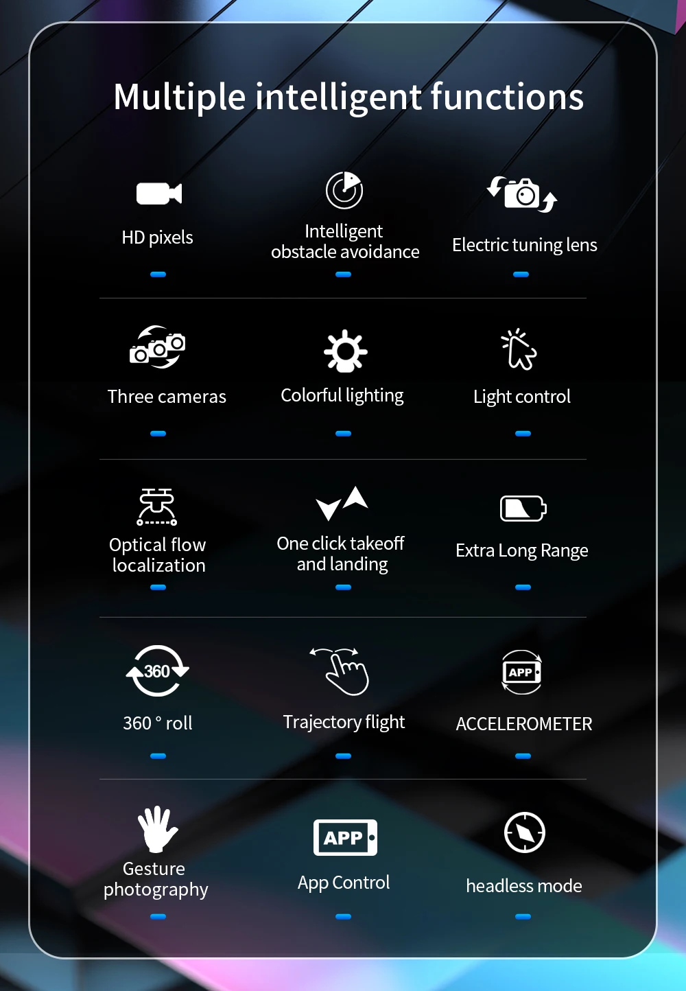Basic functions: One-key-start/one-key-landing/ascent/descent/left/right/forward/backward/left fly/right fly/smart obstacle avoidance/smart follow/up and down ESC camera/360° roll/headless mode/speed/slow file/photo/video/switch dual camera/face/gesture recognition automatic photo/gravity sensor/track flight/positioning flight/one key return home