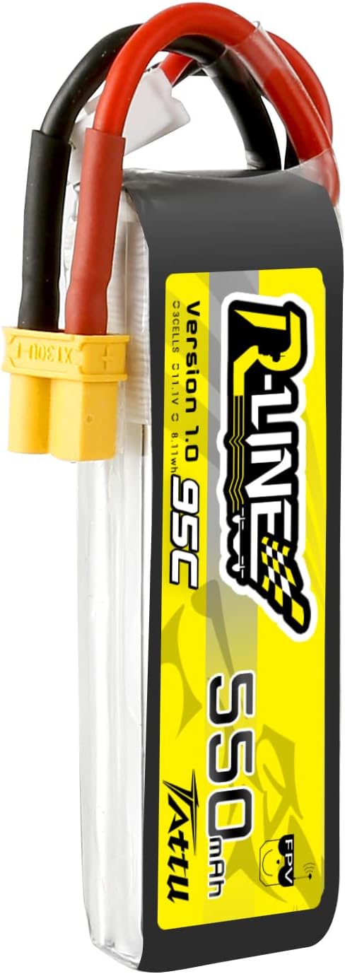 Tattu R-Line 550mAh 11.1V 95C 3S1P Lipo Battery Pack with XT30 plug has full capacity and discharge rate. It is a high discharge rate FPV racing lipo battery. The 95C gives you enough power under load. It is very compact in size and very light in weight. Works perfectly with your Multirotor FPV from size 100 to 180.