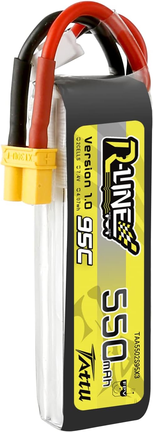 Tattu R-Line 550mAh 7.4V 95C 2S1P Lipo Battery Pack with XT30 plug has full capacity and discharge rate. It is a high discharge rate FPV racing lipo battery. The 95C gives you enough power under load. It is very compact in size and very light in weight. Works perfectly with your Multirotor FPV from size 100 to 180.