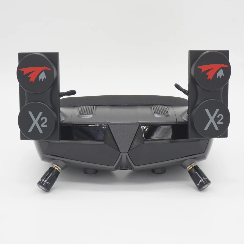 Our high efficiency X²-AIR MK II with direct angled RP-SMA connectors for installing on the Walksnail avatar HD goggles X. Simply screw on the custom angled RP-SMA connectors on the top ports of the goggles. Great 13dBic gain combined with a healthy flyable beam width of 150deg, yield an amazing long range performances. Fill the remaining ports with singularity stubby and you got the antennas full house.