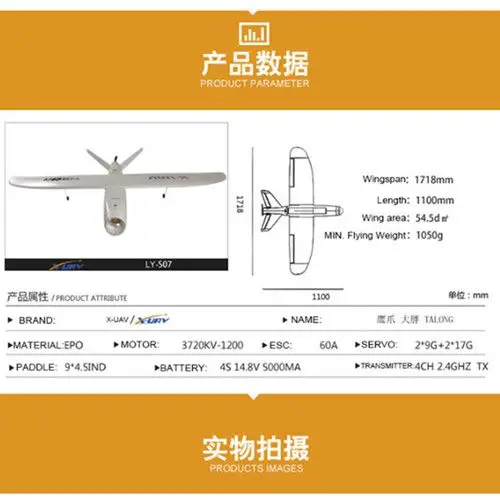 Brand:X-uav Item:Talon RC Kit V3 Material:EPO Wingspan:1718mm Length:1100mm FlyingWeight:2500~3000g WingArea:60d㎡ Wingload:55~66g/d㎡ Recommend Drive System: Drive System: 3720 KV1200 motor Thrust Force: 3000g ESC: 70A Servo: 2*9g 2*17g servos Propeller:≤12in Battery: 14.8V, 4S 10000MAH Li-polymer Control system: FS-TH9X+R9B Transmitte